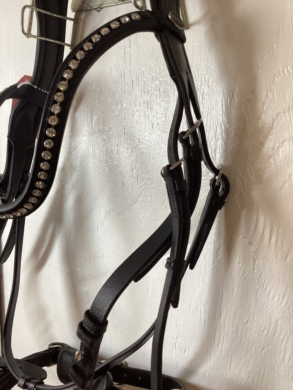 Crafted from top-quality luxurious leather with stainless steel fittings, including hook stud closures. Also includes black leather reins with hand stops, rein stops, hook studs and stainless steel fittings, sized to match the bridle.