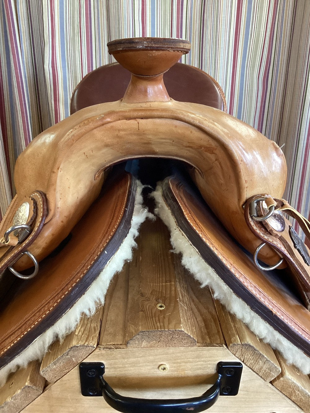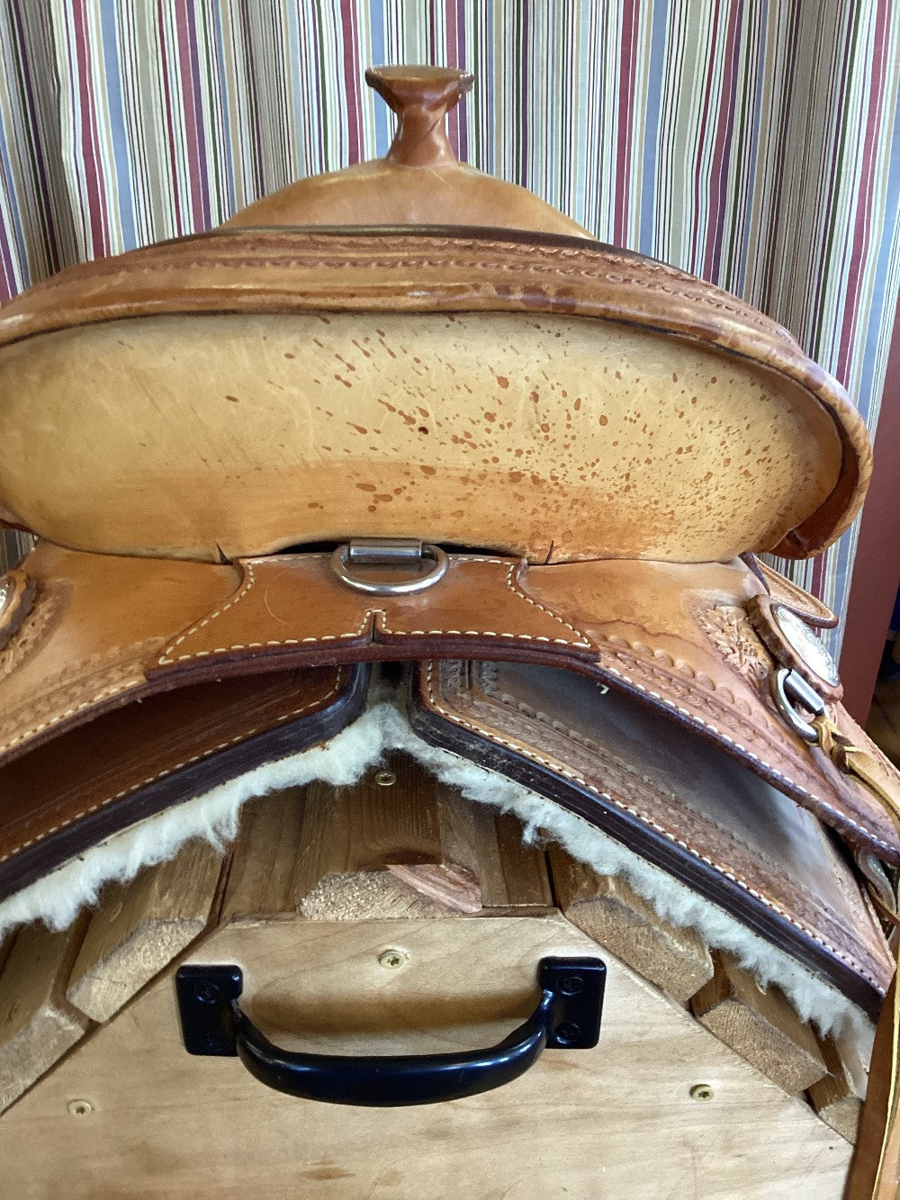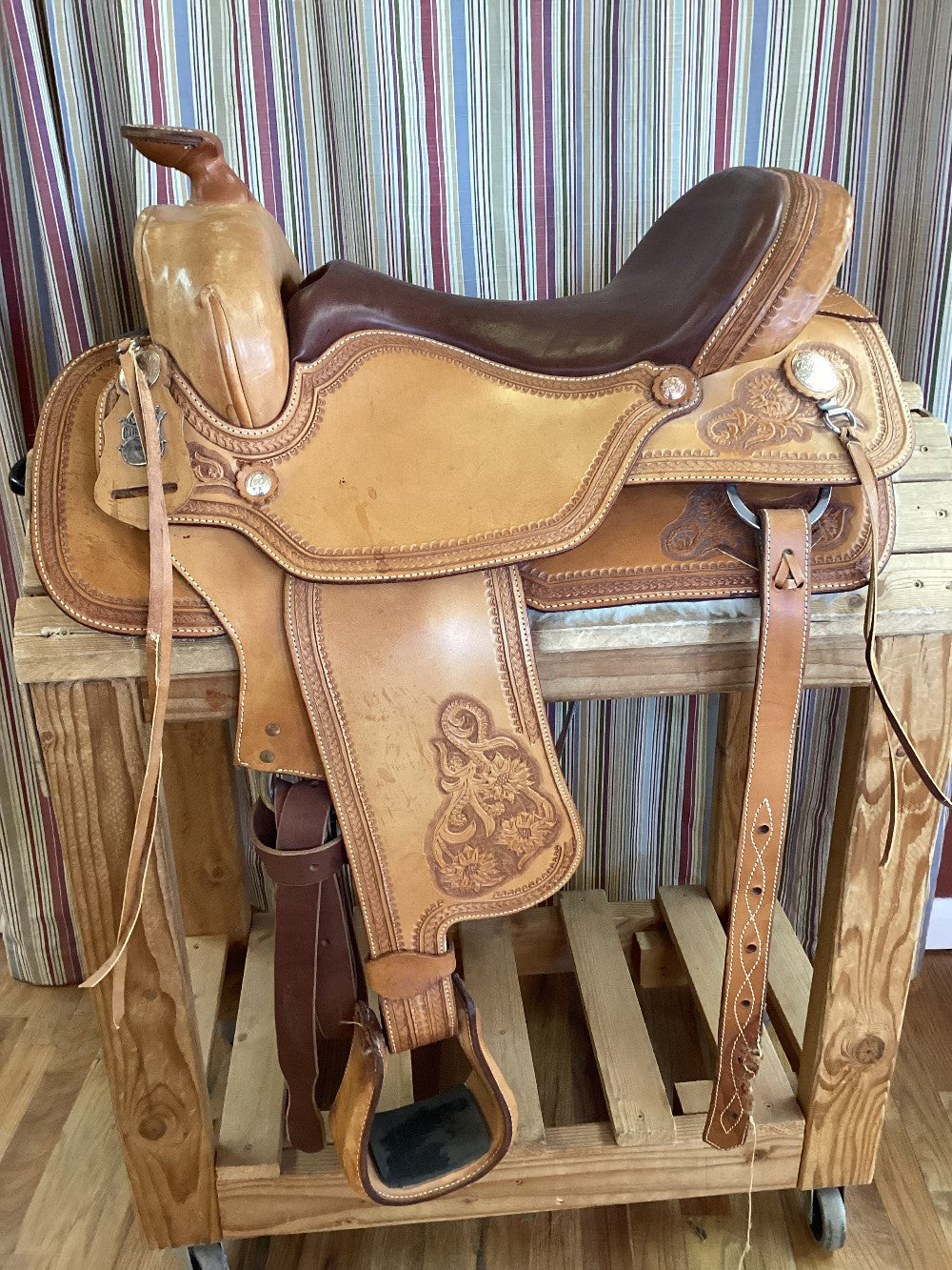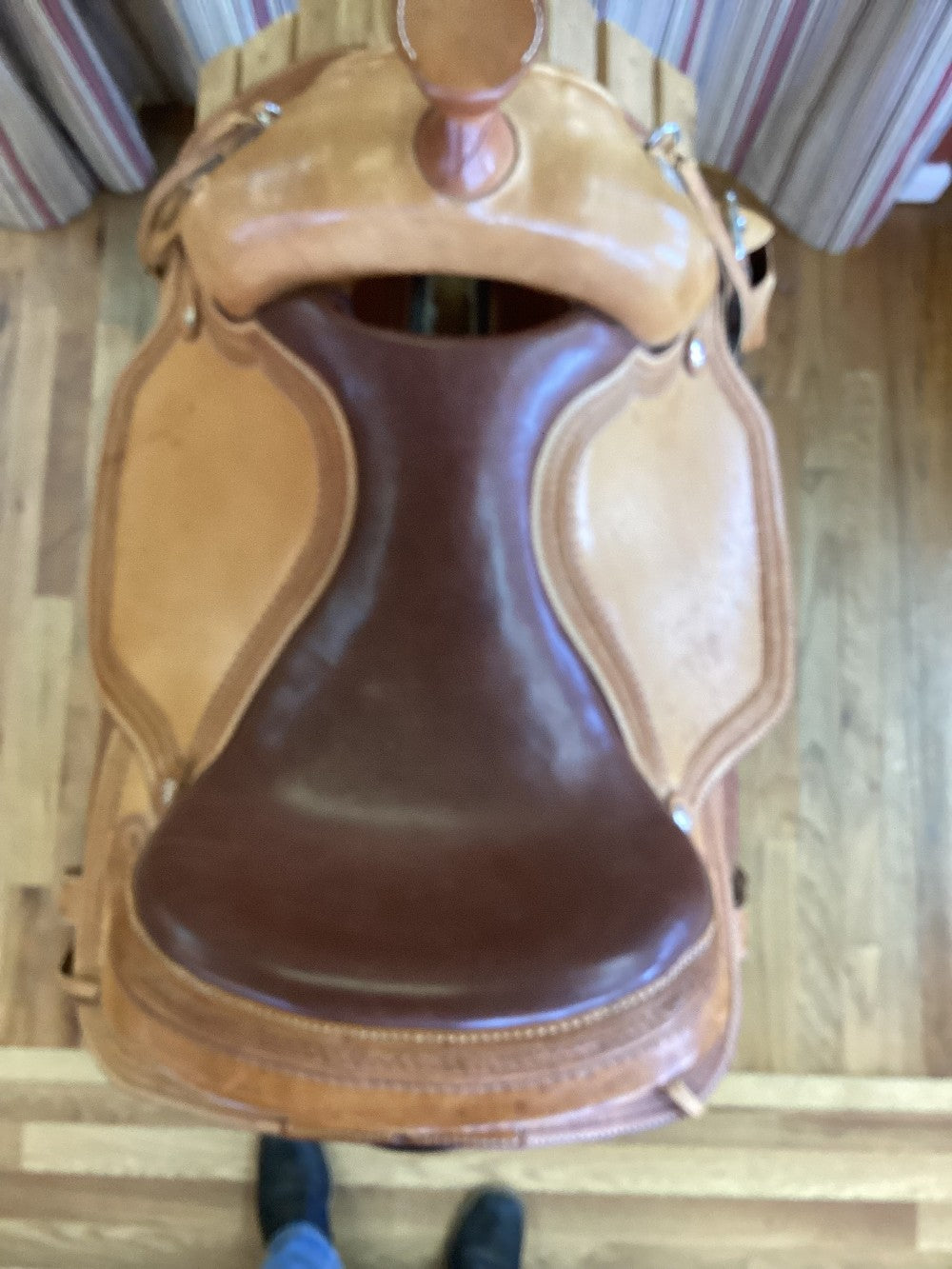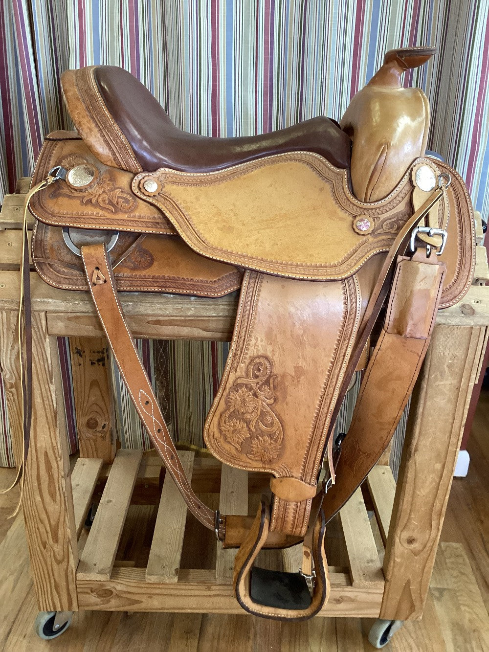 This saddle has a cushy padded seat, floral tooling, cushioned trail stirrups and a breast collar. It is in very good condition except for discolorations on the leather (see pictures).