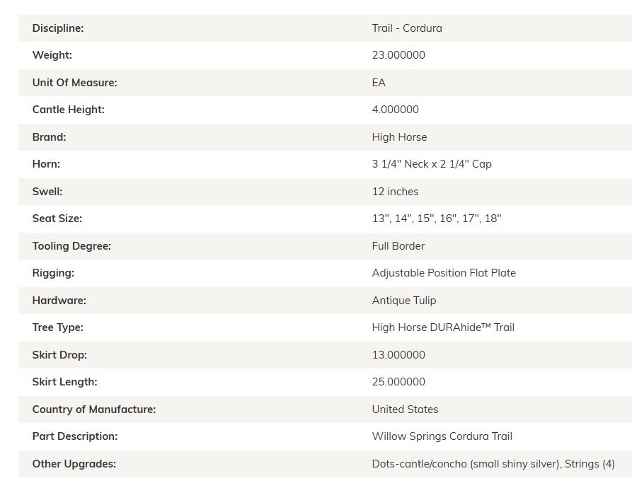 The 6913 Willow Spring Cordura® Trail saddle features a new hand tooled border pattern with silver spots, antique silver conchos, and butterfly skirt shape. Cordura® skirts and fenders keep the saddle at a lighter weight. The upgraded adjustable position slide over 3-way rigging allows you to use the rigging position best suited for your horse and provides stability on the trail. Four sets of strings to tie all your gear. The double padded seat provides all-day comfort. Easy to care for, the swell, horn, seat jockey and cantle are leather, with Cordura skirts that help to keep the saddle light. Ralide stirrups. Nylon tie straps are included on both sides of the saddle.