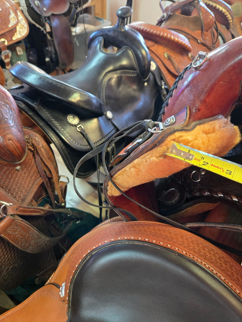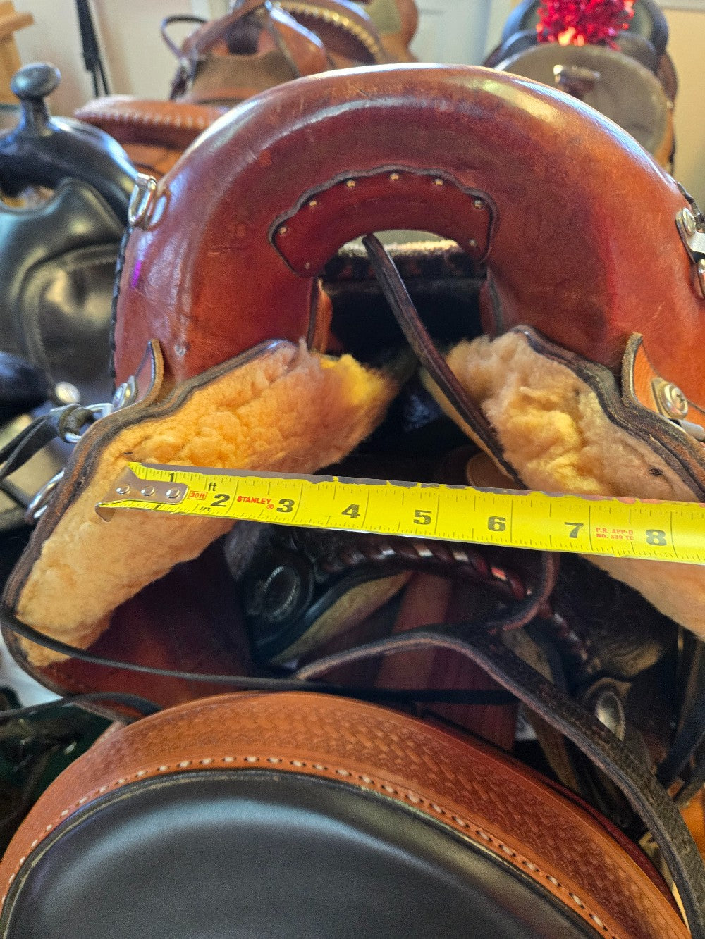 Good Condition Sheep skin lined Rigged for a dressage girth Comfortable rough out padded seat Wide cushioned trail stirrups Wide tree