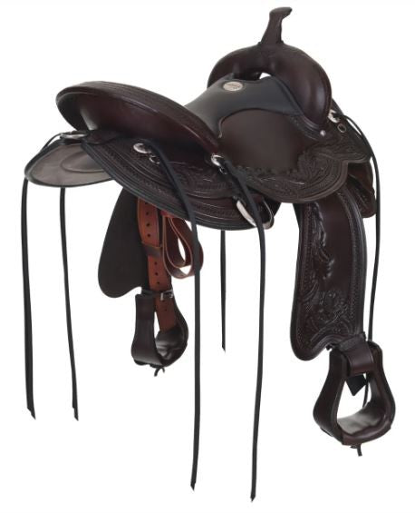 This round skirted saddle is ideal for trail riding. Beautiful hand tooling and contrasting black seat and strings make the 1750 Julie Goodnight Wind River a truly gorgeous saddle. With the Flex2® tree technology, it conforms to the horse’s back while providing rider weight distribution and is lightweight.