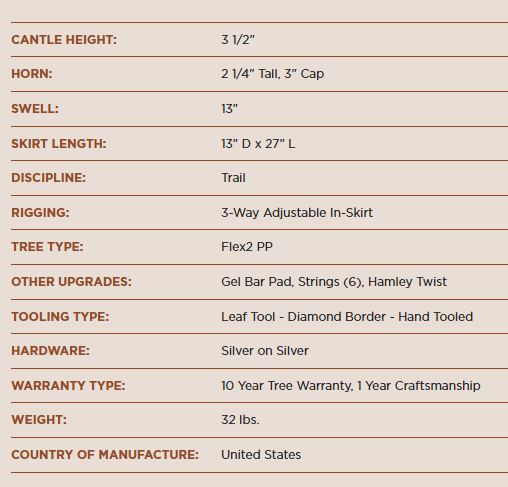 Flex2® skirts have a shock-absorbing neoprene filler for the horse and rider’s comfort; skirt has a close contact design for precise cueing, a Slip-Not™ skirt liner for easy care with XPG™ gel bar pad for your horse’s comfort, Impact Foam seat with narrow twist and broad pocket for all-day comfort, Softee® seat jockeys and fenders provide a “ready to ride” saddle to minimize rider’s knee and ankle strain because they are broke in right from the start. ErgoBalance stirrups™ and pre-twisted stirrup leathers reduce knee and ankle fatigue while promoting balanced riding.